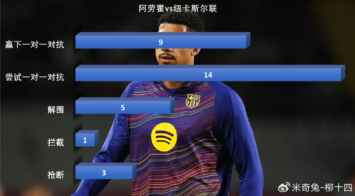 阿劳霍本场比赛尝试了14次一对一对抗,赢下了其中的9次,贡献了3次抢断5次解围和1次拦截。弗里克要求阿劳霍前顶到非常高的位置,这样一来库巴西可以利用自己的球商和空间意识,完成更好的选位。