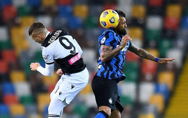 孔蒂的球队在弗留利球场,迎头撞上了一座坚实的石头城。你肯定不想在晚上11点的街道上,遇到一脸恶汉相的“乌鸡”卫将努伊丁克、贝康和迪马约,但即使是面目俊朗的博尼法齐出战,也不影响戈蒂的球队在防守端的硬度。乌迪内斯三天内两平蓝黑,几乎完全冻结了两支火力冠绝联赛的球队。“石头城”百密中的一疏,出现在上半场第23分钟:贝康后场出球失误,乌龙助攻劳塔罗,但蓝黑10号的单刀球,被好友兼国家队队友穆索神奇封出。